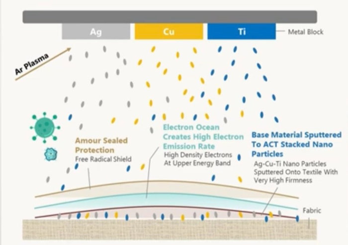 Sputtered with nanoparticles of Ag, Cu and Ti atoms, the ACTife materials can generate a shield of free radical on the surface of the fabric. This microcurrent charged surface is powerful to destroy bacterial cell membrane and proteins in the virus, therefore contributing to the death of bacteria and loss of activities of viruses.