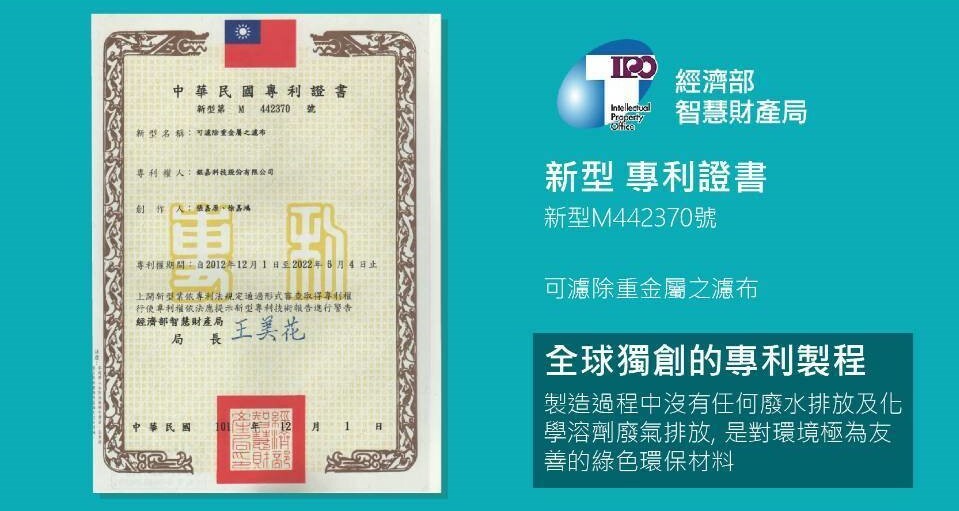 ★可濾除重金屬之濾布(M442370) 臺灣新型專利